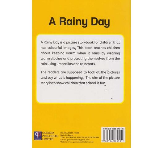 A Rainy Day is a picture storybook for children that has colourful images. This book teaches children about keeping warm when it rains by wearing warm clothes and protecting themselves from the rain using umbrellas and raincoats.
