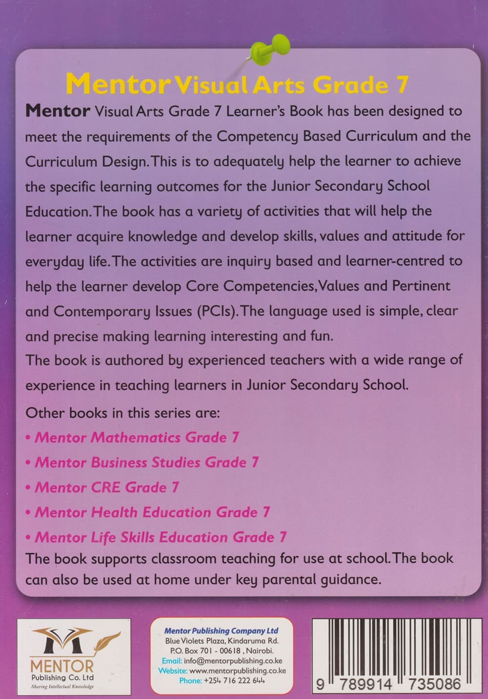 Mentor Visual Arts Grade 7 is a CBC-aligned coursebook that nurtures learners’ creativity, imagination, and artistic skills. It covers strands such as Drawing, Painting, Sculpture, Design, Crafts, and Appreciation of Art, enabling learners to explore diverse forms of artistic expression.